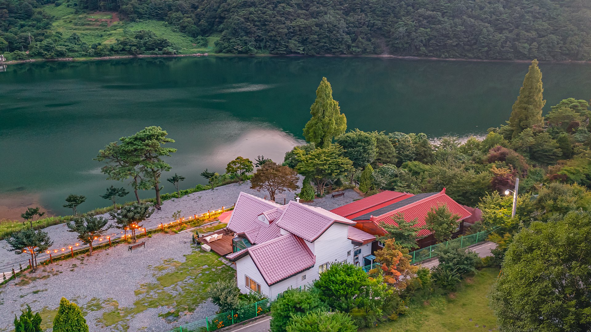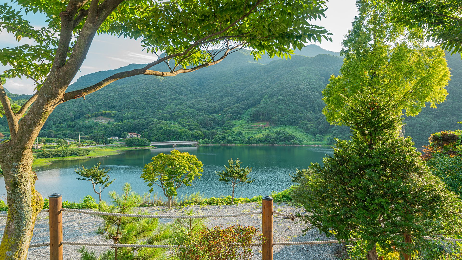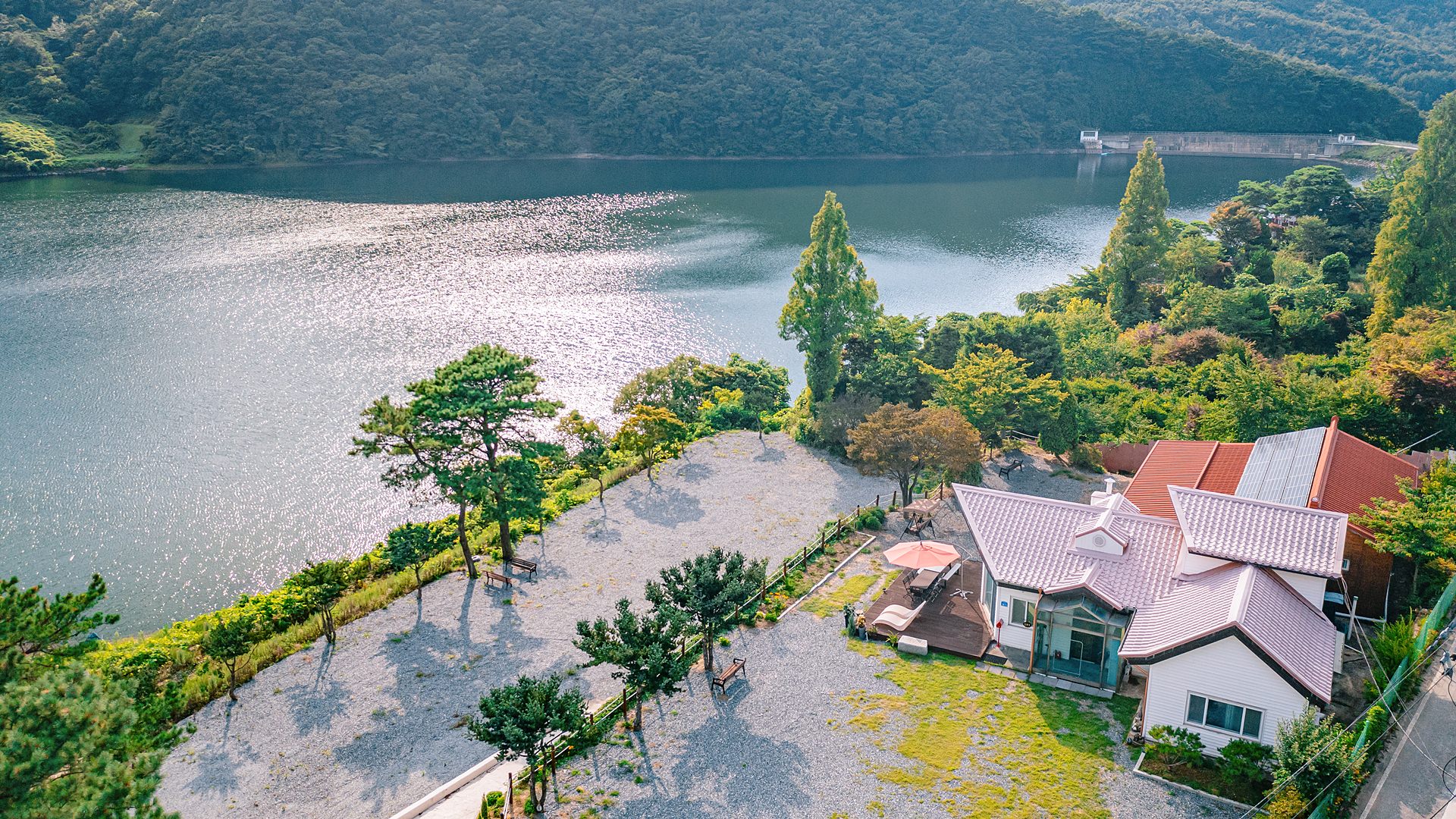 창밖으로 펼쳐진 호수와 대둔산 풍경