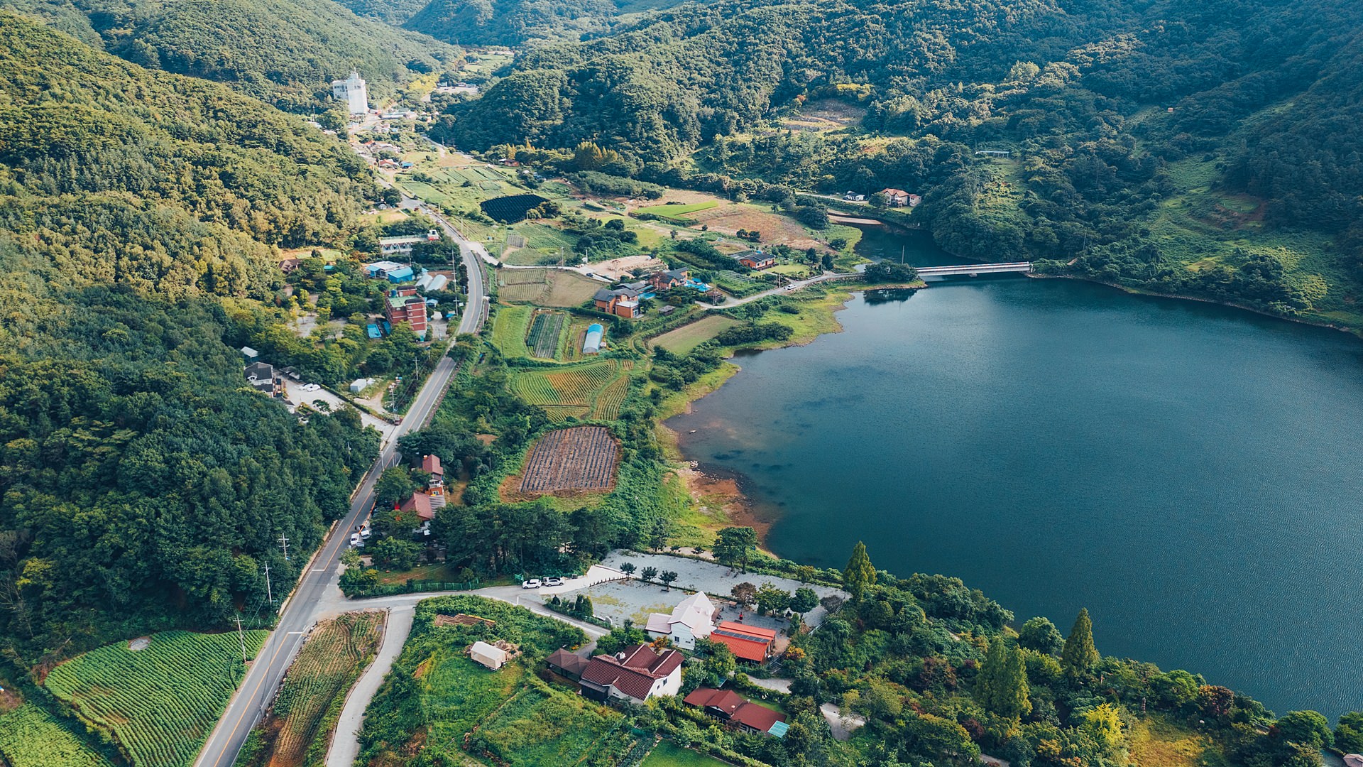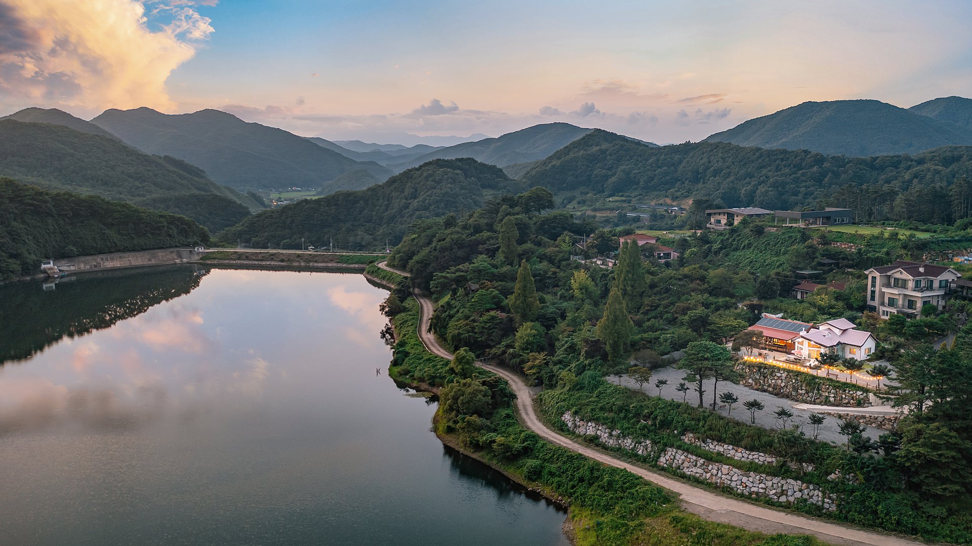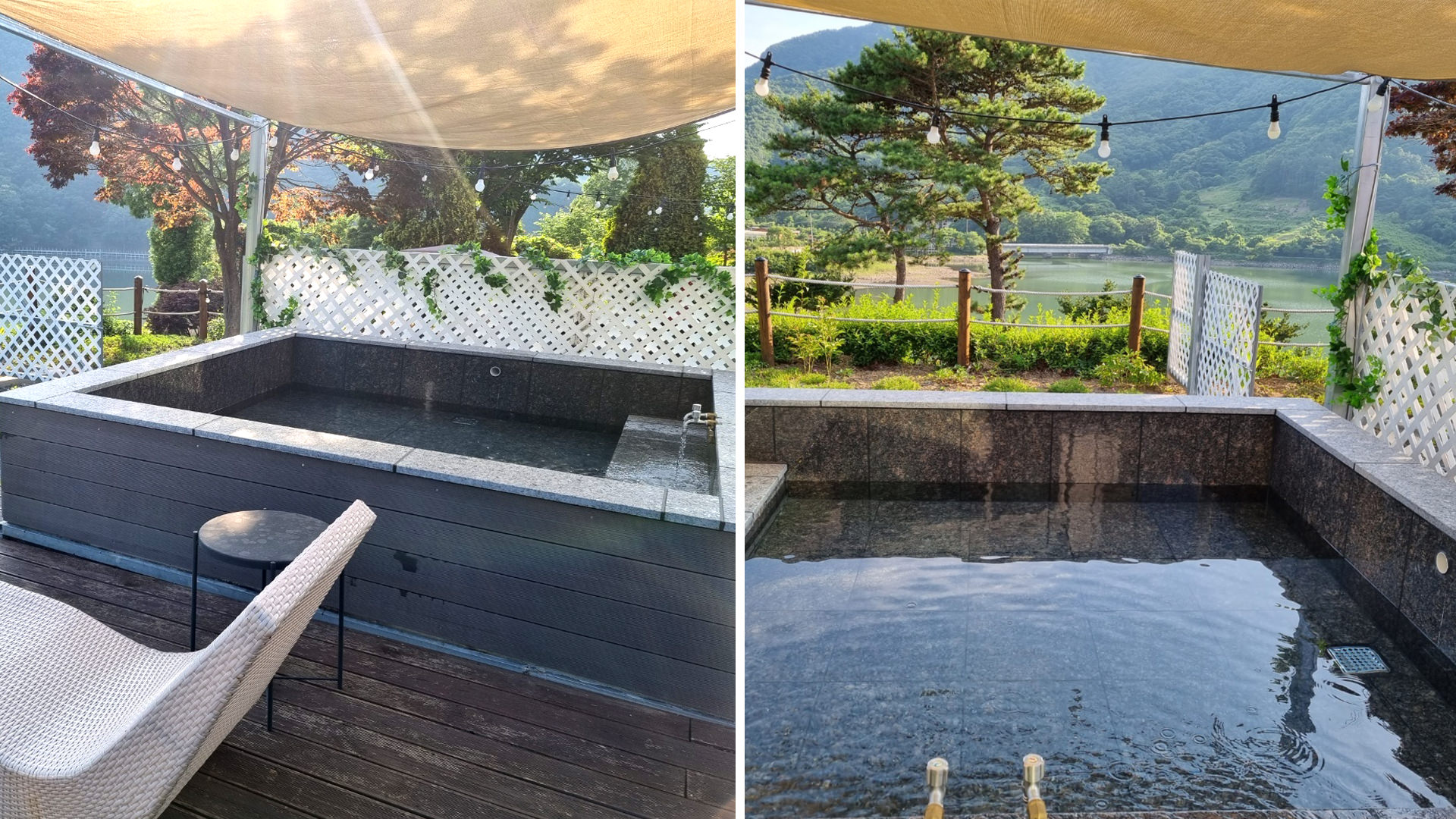 창밖으로 펼쳐진 호수와 대둔산 풍경