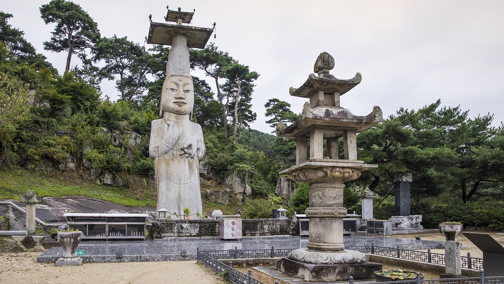 관촉사는 비사실적인 모습을 하고 있는 은진미륵으로 유명합니다.